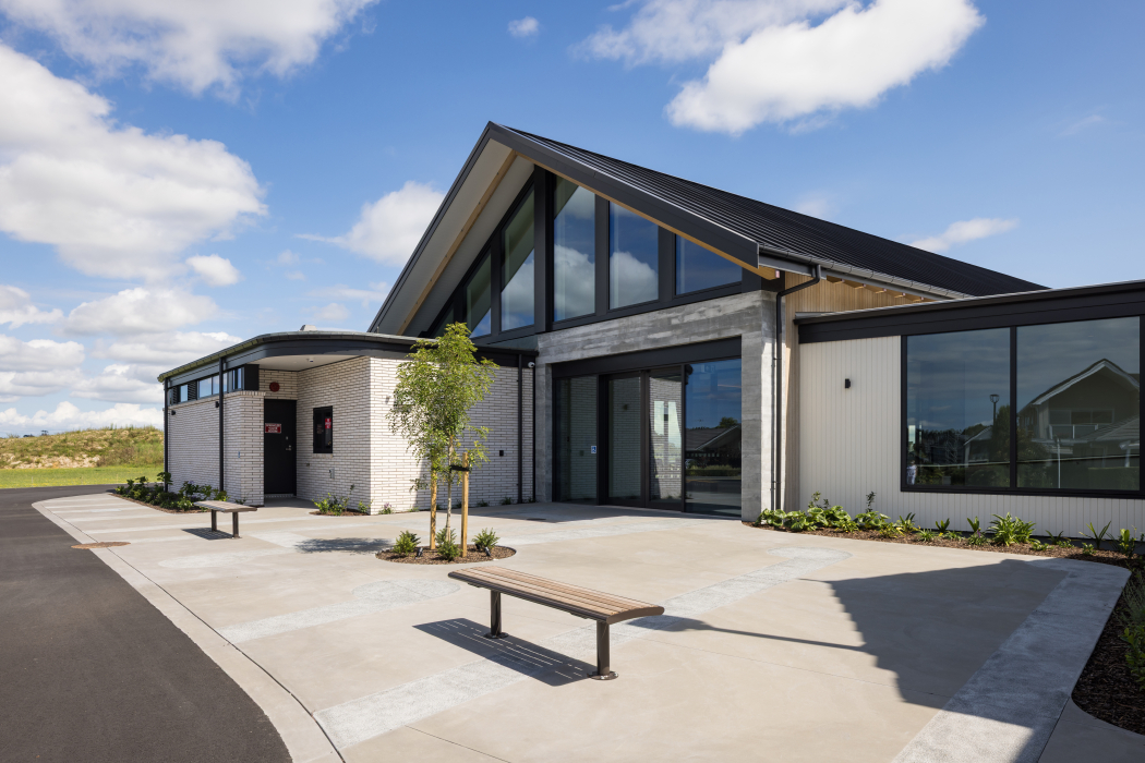 Clad in white brick and Abodo weatherboards, a steeply pitched roof and exposed rafters, the extension subtly references the original clubhouse, a 120-year-old villa that was trucked from Parnell to the site many years ago.