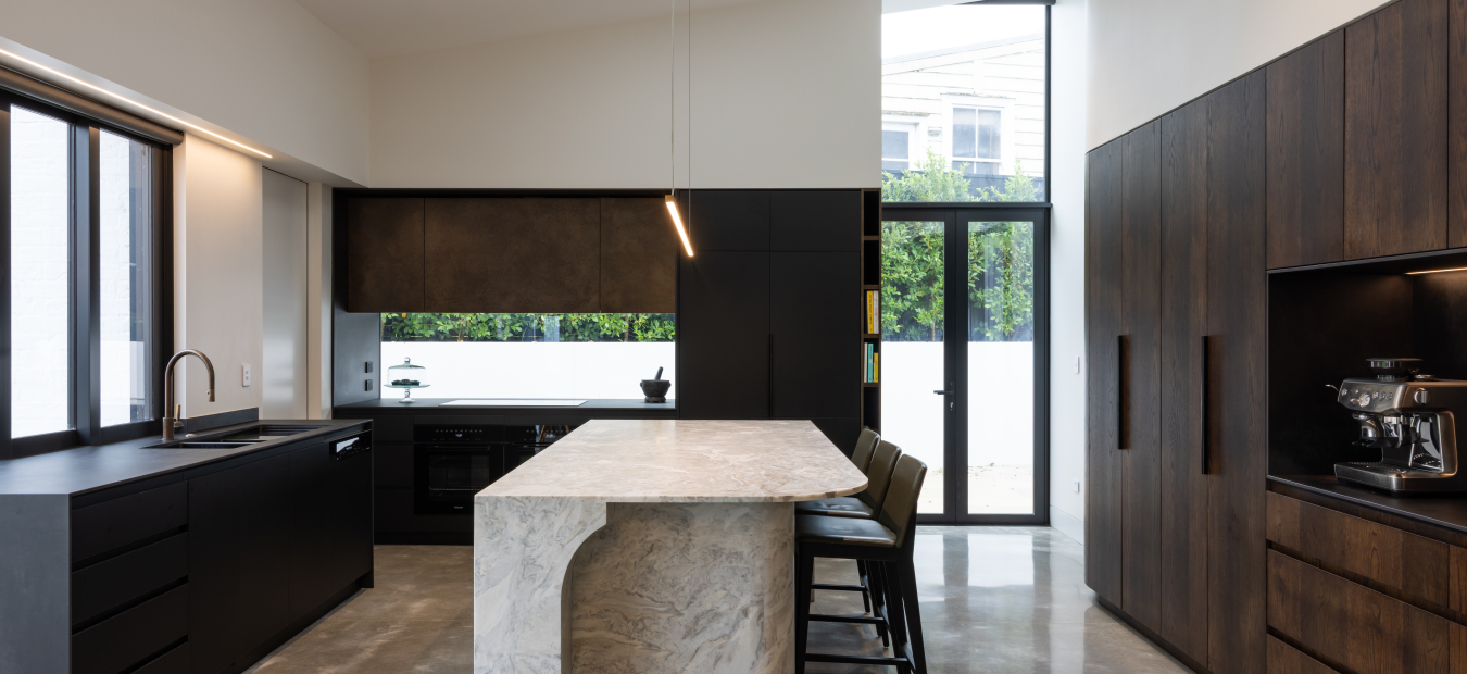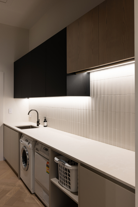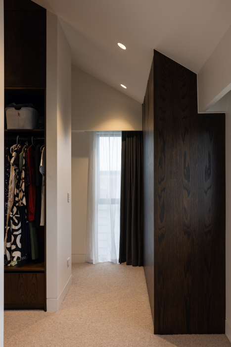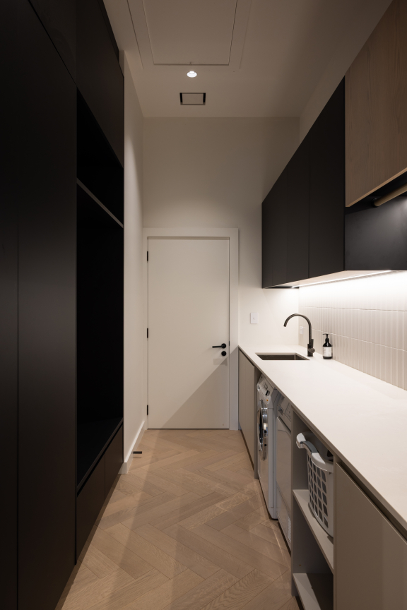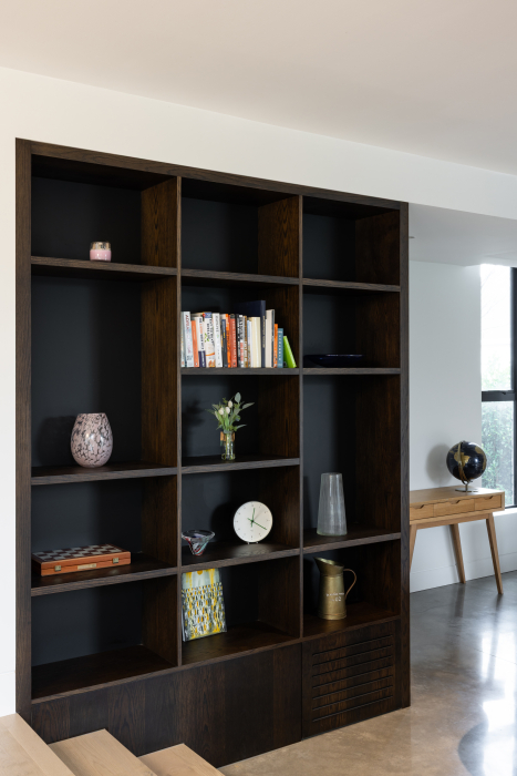 The same attention to detail continues throughout the house – in the dark timber shelving and TV ‘shroud’ of the sunken living area, and the bespoke wardrobes in the bedrooms, which were crafted to harmonise with the villa’s existing features. Elsewhere, the team used a mix of melteca board and veneer for the scullery and laundry, and installed a new oak handrail on the stairs.