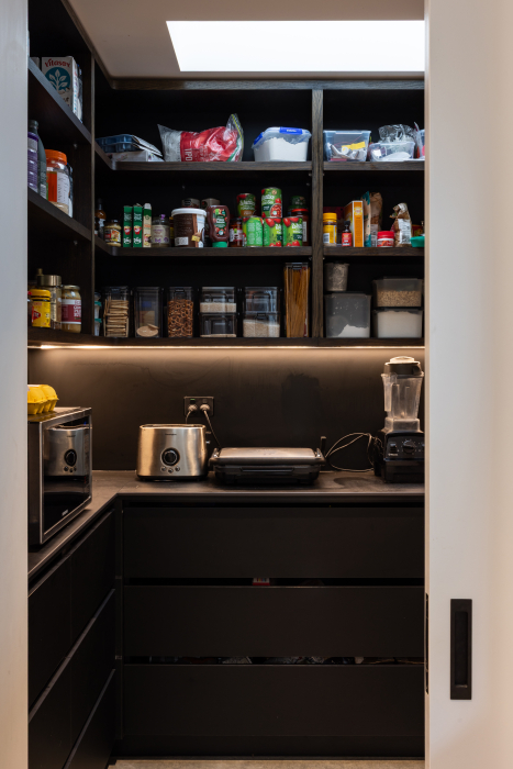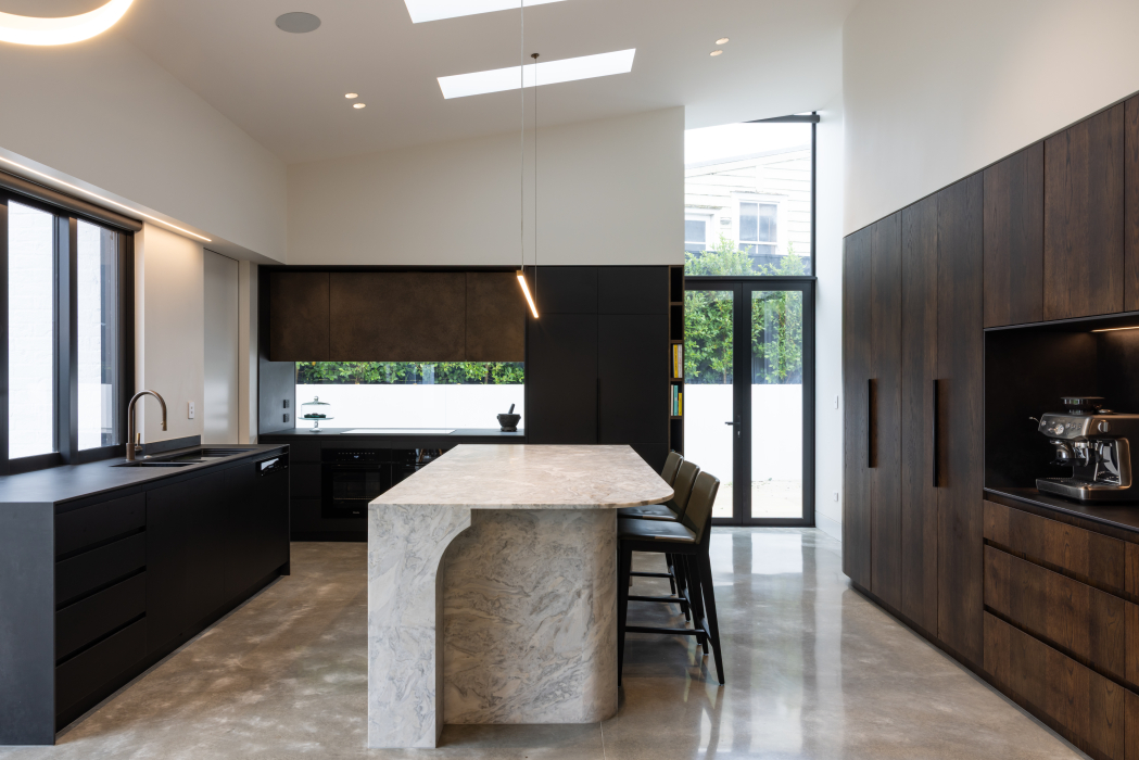 Around the sink, the oak is replaced by a matte Ultraglaze acrylic designed to resist fingerprint marks. Above the cooktop, meanwhile, a subtle metallic paint was used to inject a semi-industrial look, as per the clients’ wishes.