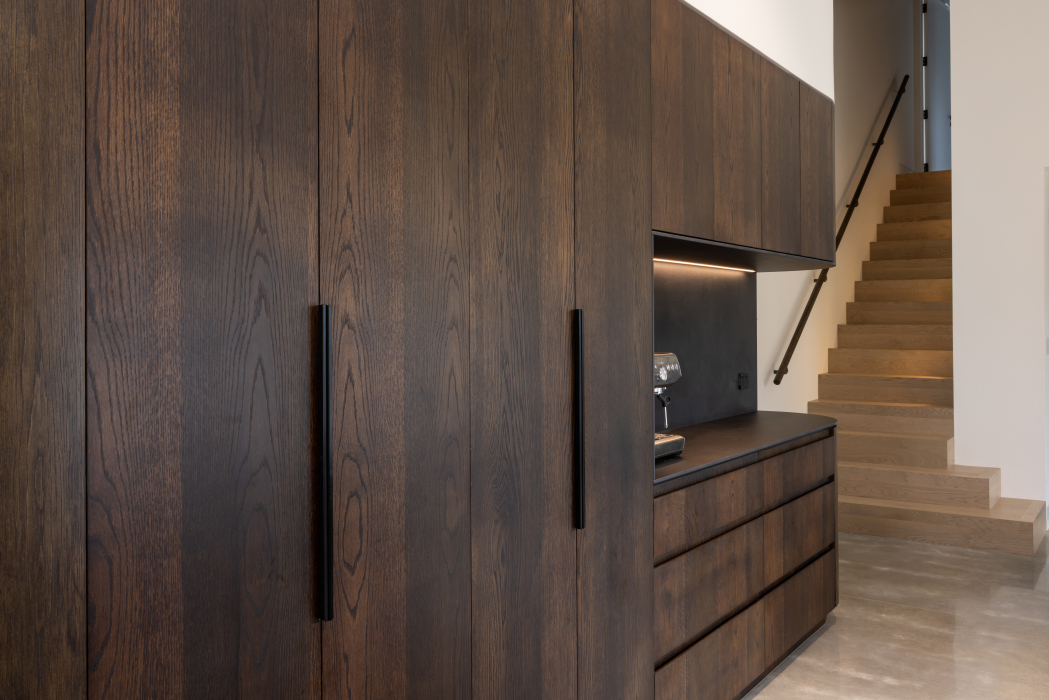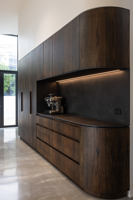 This was a project that the Haydn & Rollett Joinery department took great pride in, a villa upgrade that called for high-end materials, precision craftsmanship, excellent client communication and a dash of style. In the kitchen, a row of tall cabinetry built of American white oak stained to a rich, dark walnut is finished with a graceful Deco-like curve at either end.