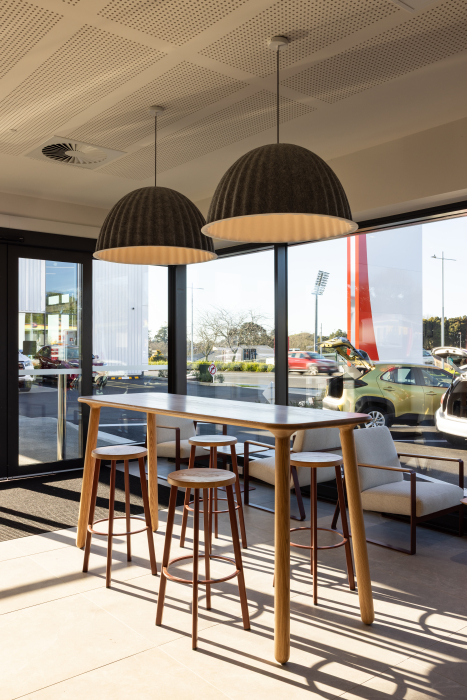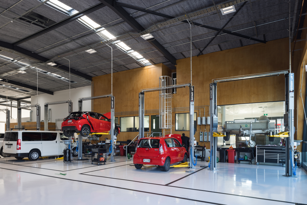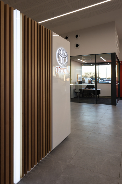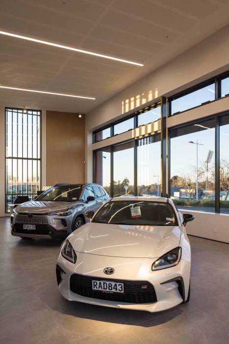 Working with the past can throw up surprises, as the Haydn and Rollett team involved in this commercial project in Pukekohe learned. As well as building a new showroom for Toyota, they were tasked with partially demolishing and repurposing a neighbouring warehouse into a workshop for the dealership, complete with a seismic upgrade. Early on, it was discovered that the existing structure was not up to snuff and had to be remediated. Being located alongside the main trunk line, there was also a need to insert significant piling deep under the existing floor, an awkward and time-consuming process.
